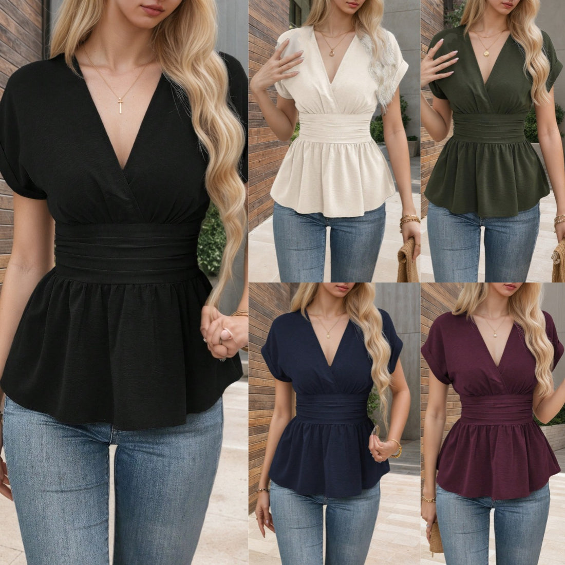 Summer Solid Color And V-neck Waist Pleated Waist Tight Shirt Top