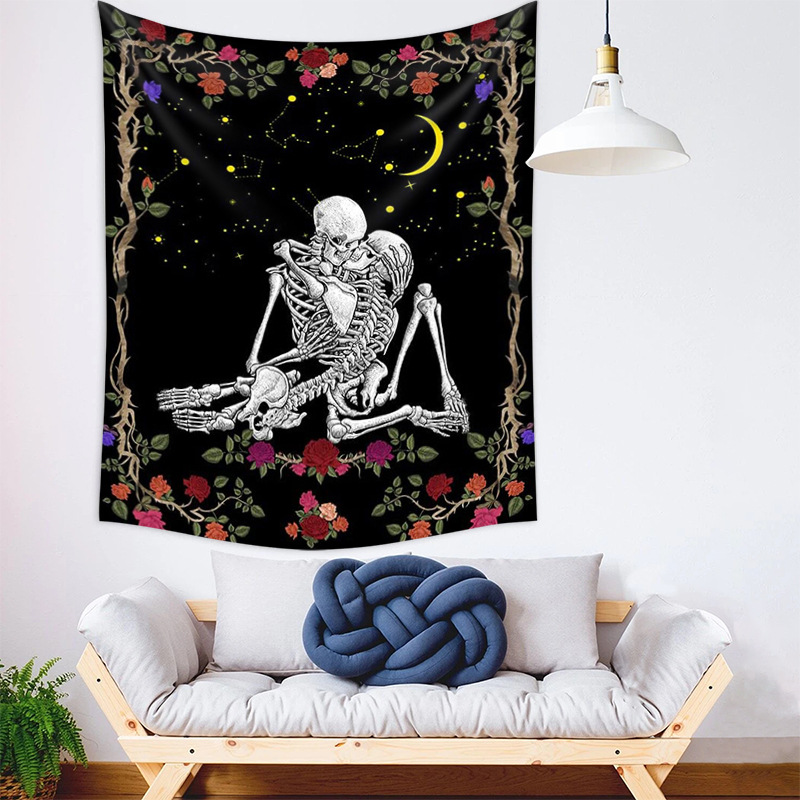 Black And White Skull Rose Lovers Home Decor Tapestry