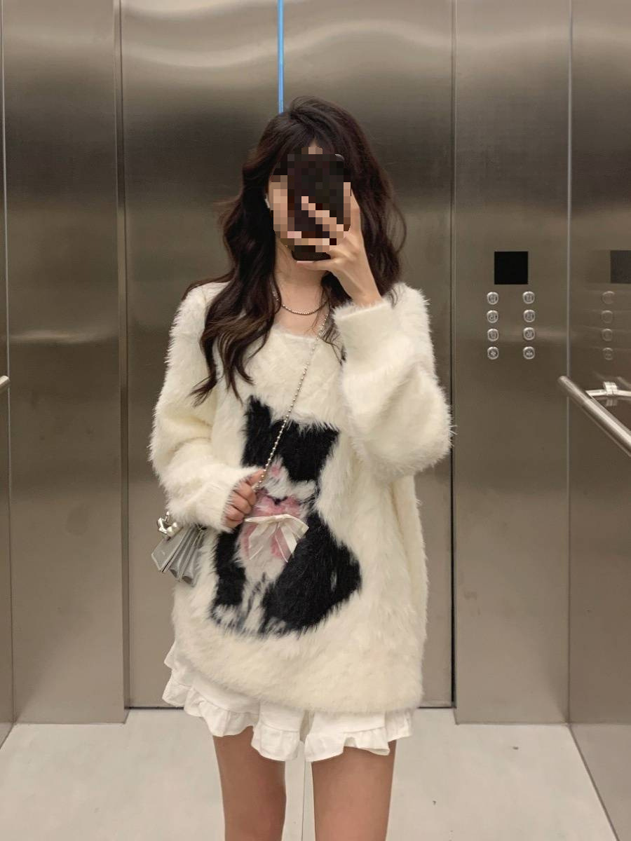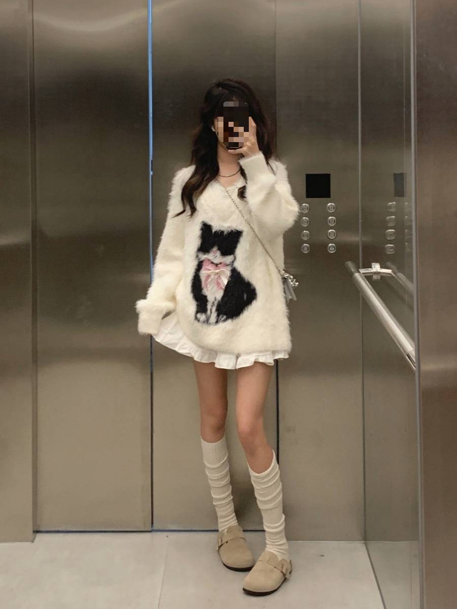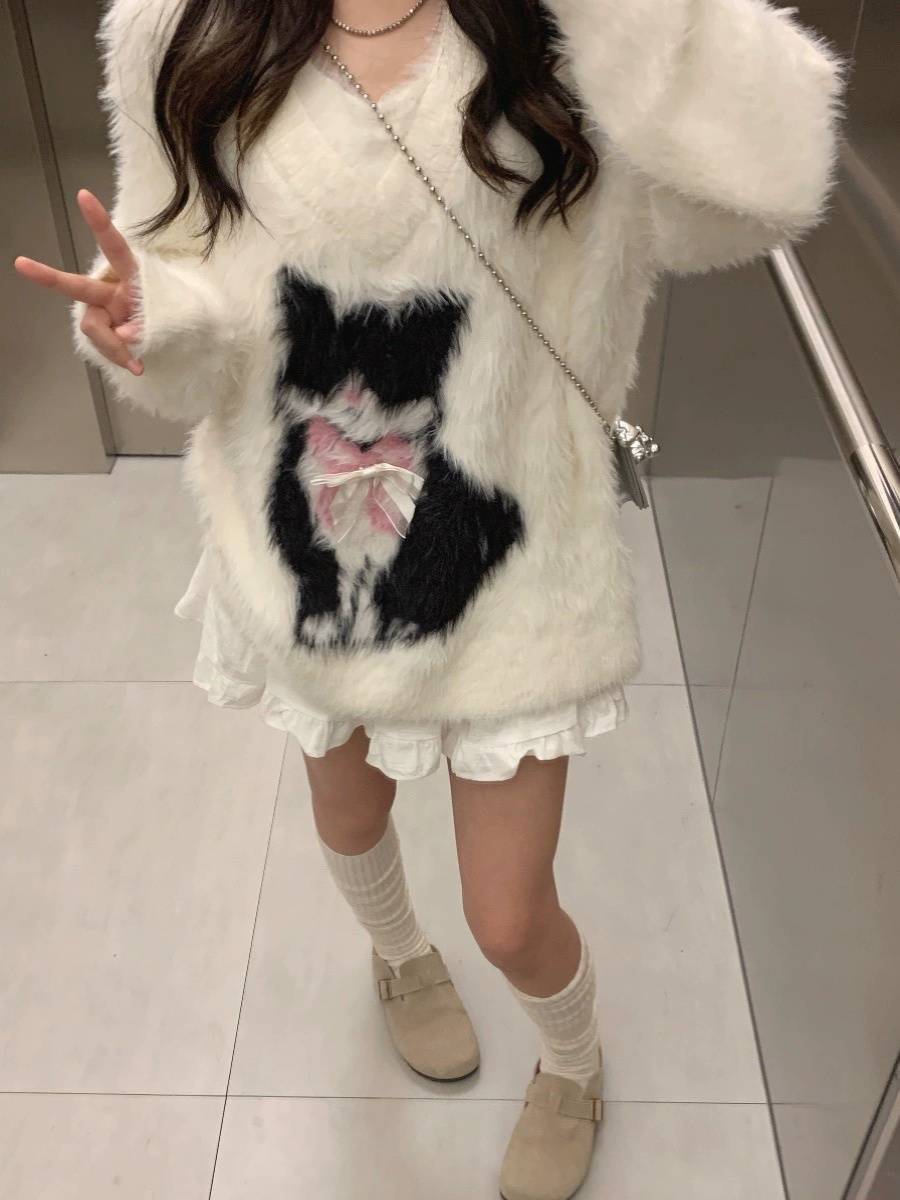 Cat Jacquard Artificial Mink Hair V-neck Sweater