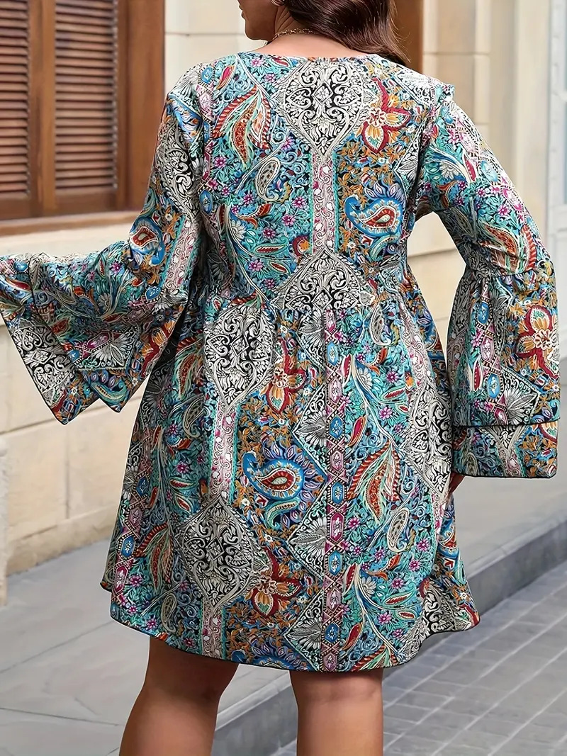Fashion Printed V-neck Plus Size Plump Girls Bell Sleeve Dress