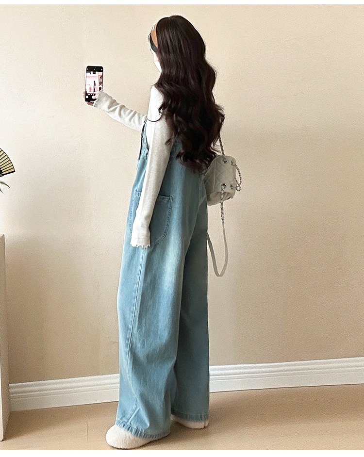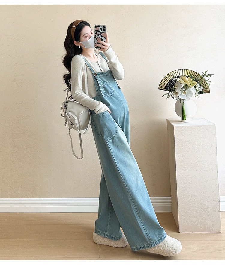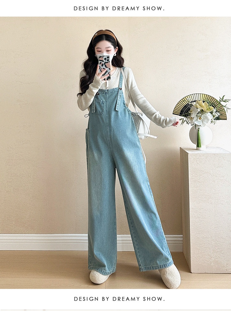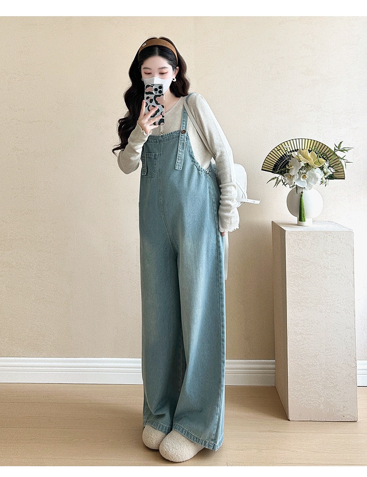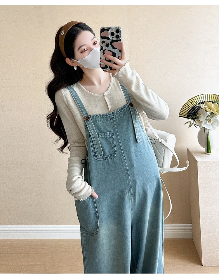 Simple New Long Sleeve Top Washed Denim Maternity Bib Pants
