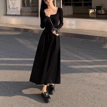 Square Collar Knitted Dress Women's Waist A- Line Long Skirt
