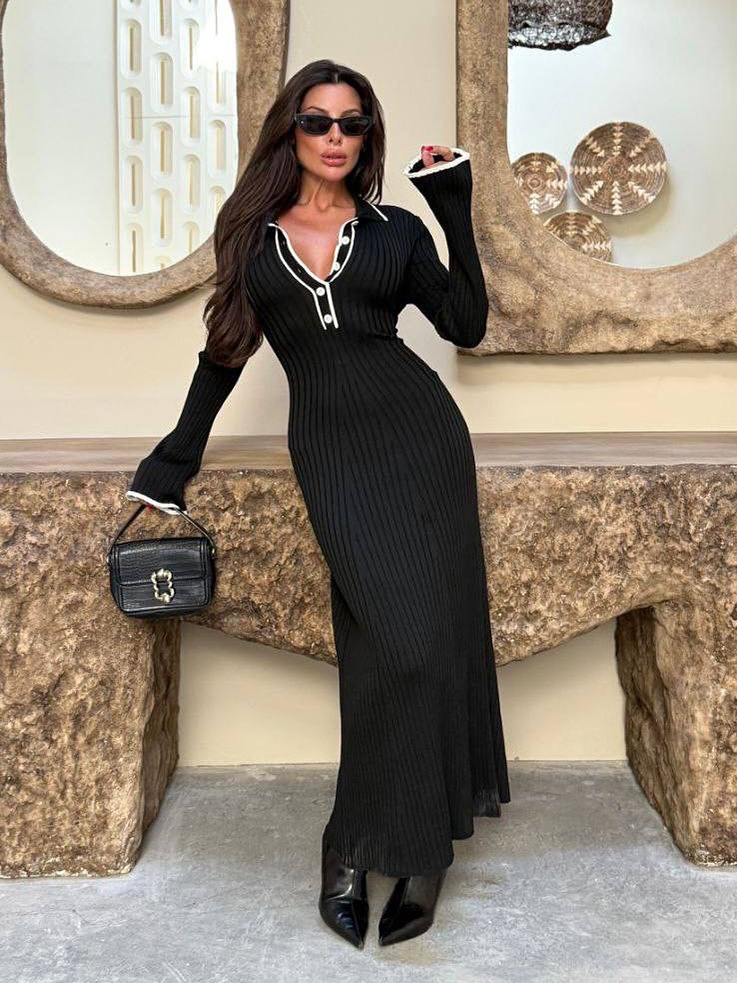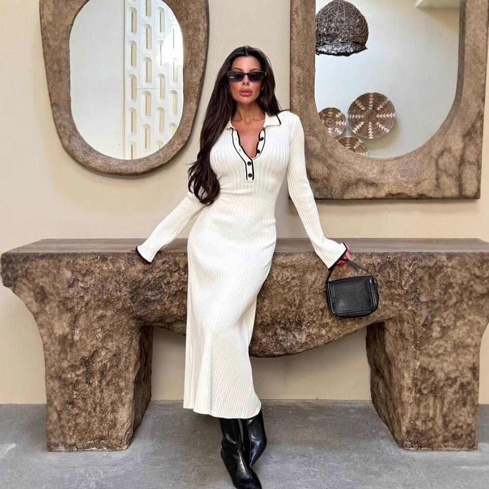 Women's Long-sleeved Lapel Contrast Color Knitted Fallwinter Sweater Dress