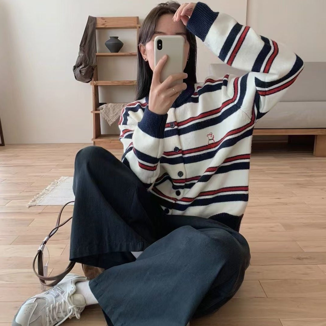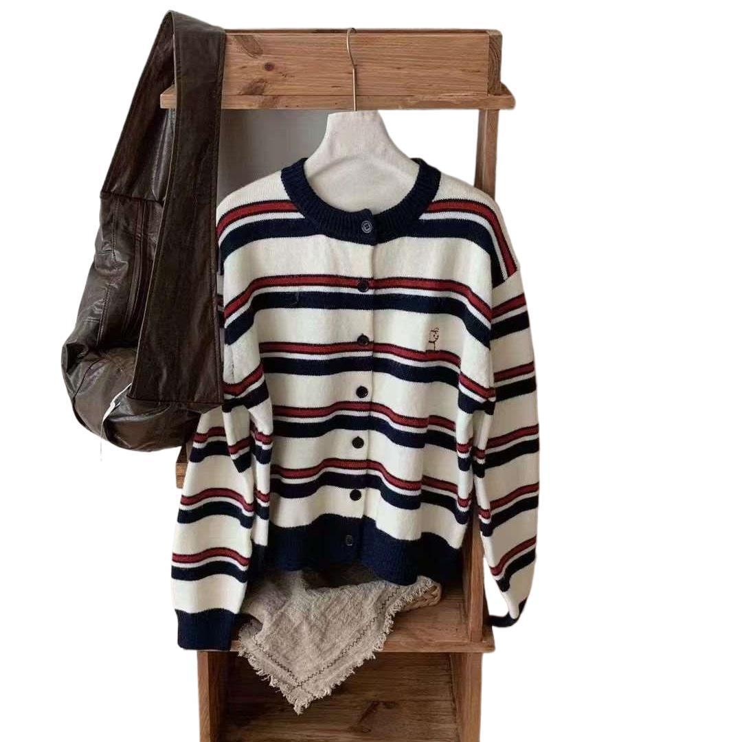Women's Loose Round Neck Striped Contrast Color Puppy Embroidered Coat